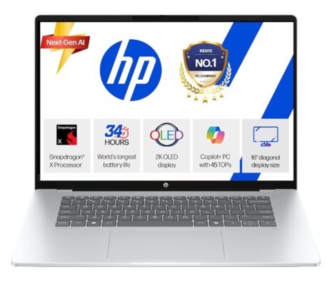 HP Omnibook 5 OLED (Previously Pavilion), Snapdragon X Processor (16GB LPDDR5x,1TB SSD) 2K OLED,16”/40.6cm, Win11, M365*Office24, Glacier Silver, 1.59kg, fb0001QU, Backlit, Next-Gen AI Laptop